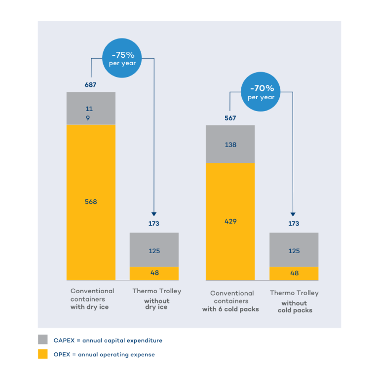 The Thermo Trolley can reduce annual total costs by up to 75% while completely eliminating the need for dry ice and ice packs. The return on investment is usually achieved within approximately one year.