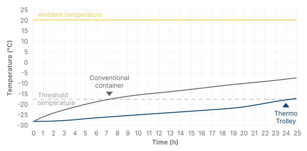 This test also shows that the Thermo Trolley achieves twice the performance of conventional containers.