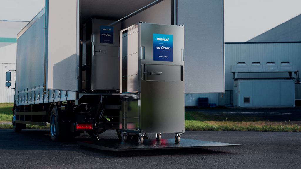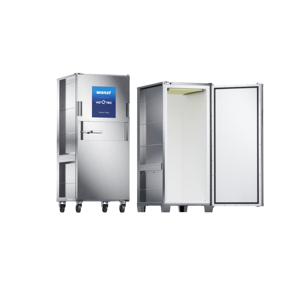 The main difference lies in the use of highly insulating vacuum insulation instead of conventional PU foam insulation, which radically simplifies logistics processes. This technology eliminates the need for dry ice, cooling packs, and special refrigerated vehicles, making daily operations more efficient. In addition, the robust and modular design ensures a longer service life and better repairability, while customers also benefit from the strong partnership between Wanzl as a design expert and va-Q-tec as a specialist in high-tech insulation.